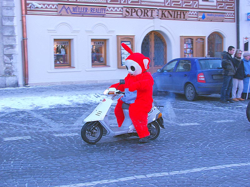 K vidění byly i Teletubies, zde Pó dráždí svého skůtra.